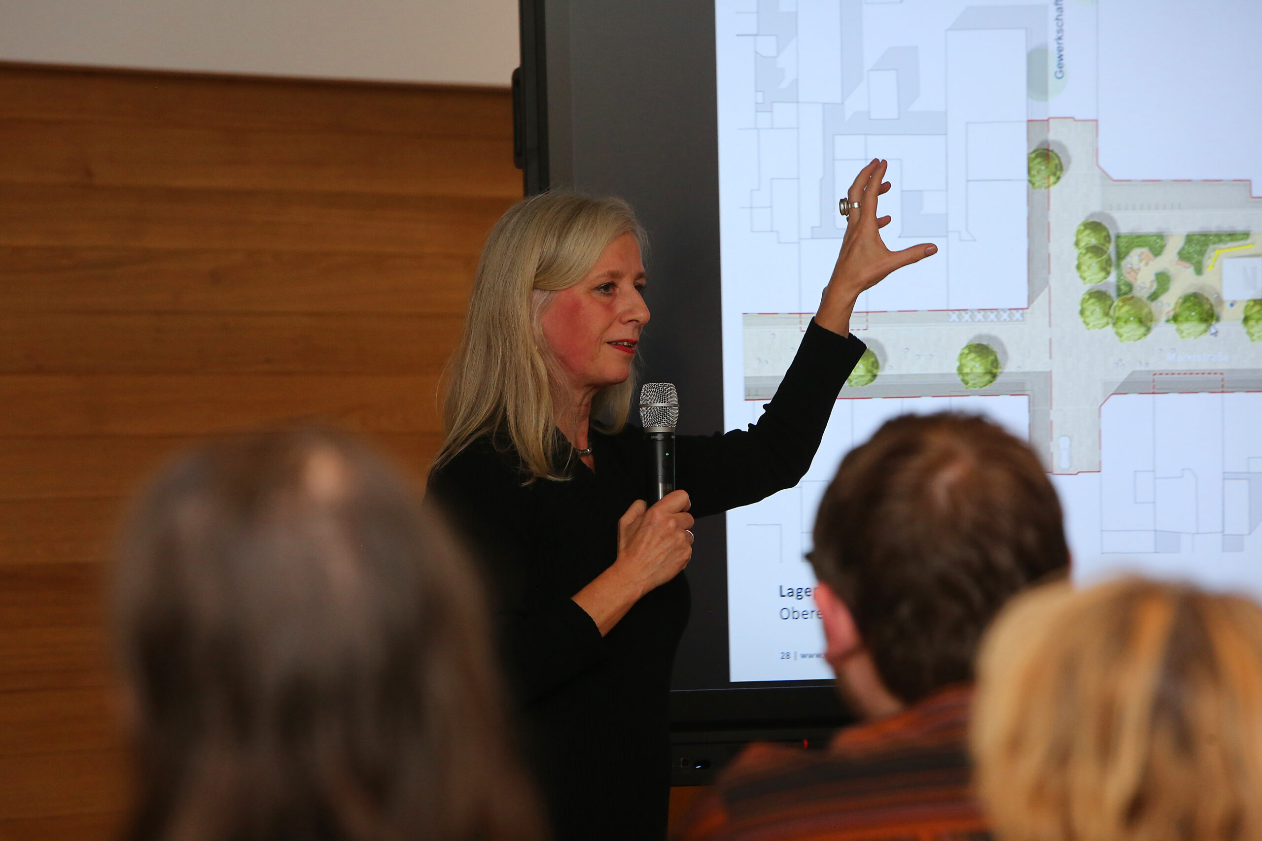 Landschaftsarchitektin Frau Wehberg-Krafft vom beauftragten Planungsbüro WES stellt die Gestaltungsideen für die Marktstraße vor. Geplant sind unter anderem mehr Grünflächen, ein Wasserspiel vor der Kirche sowie neue Aufenthaltsbereiche mit Sitzmöbeln und Spielgeräten an der Oberen Marktstraße und auf dem Eduard-Berg-Platz.